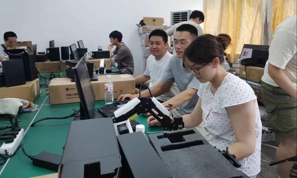 培训由深圳市越疆科技股份有限公司的工程师进行授课,采取了理论教学与实践操作相结合方式。理论教学环节详细讲授了ROBOT Magician机器人系统的部件组成、功能、配套软件及软件的使用。实践教学环节教授了使用机器人图像系统和编程,完成机器人标定、方块颜色识别、特征匹配、尺寸测量和分拣等实践项目。