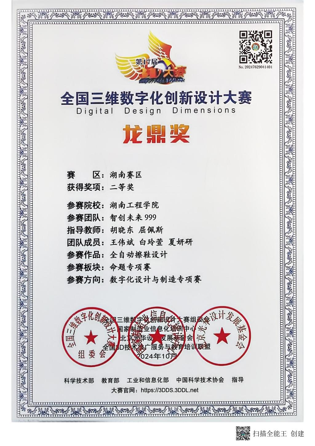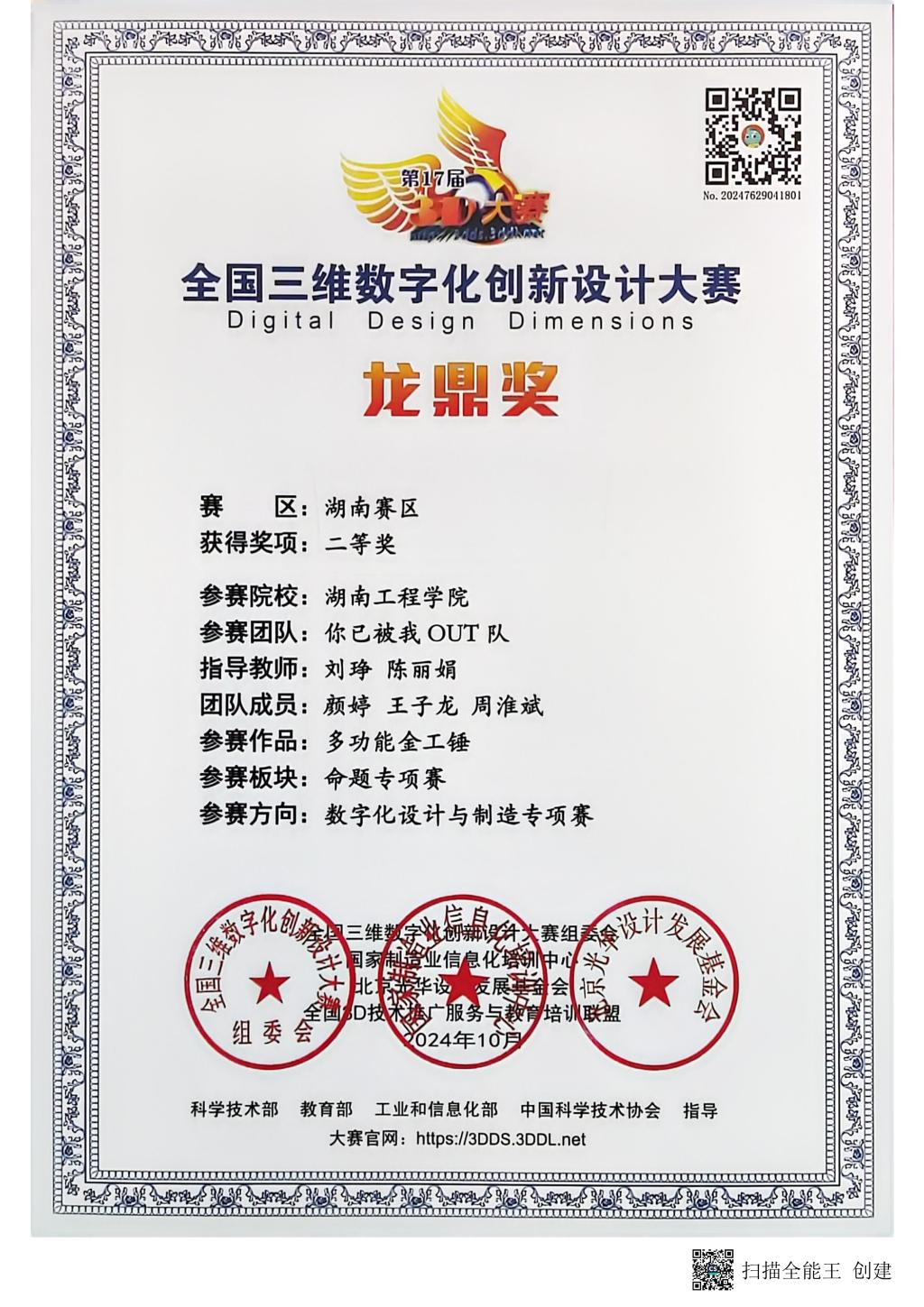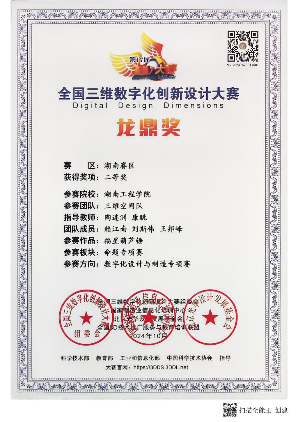 全国三维数字化创新设计大赛“龙鼎奖”湖南赛区二等奖